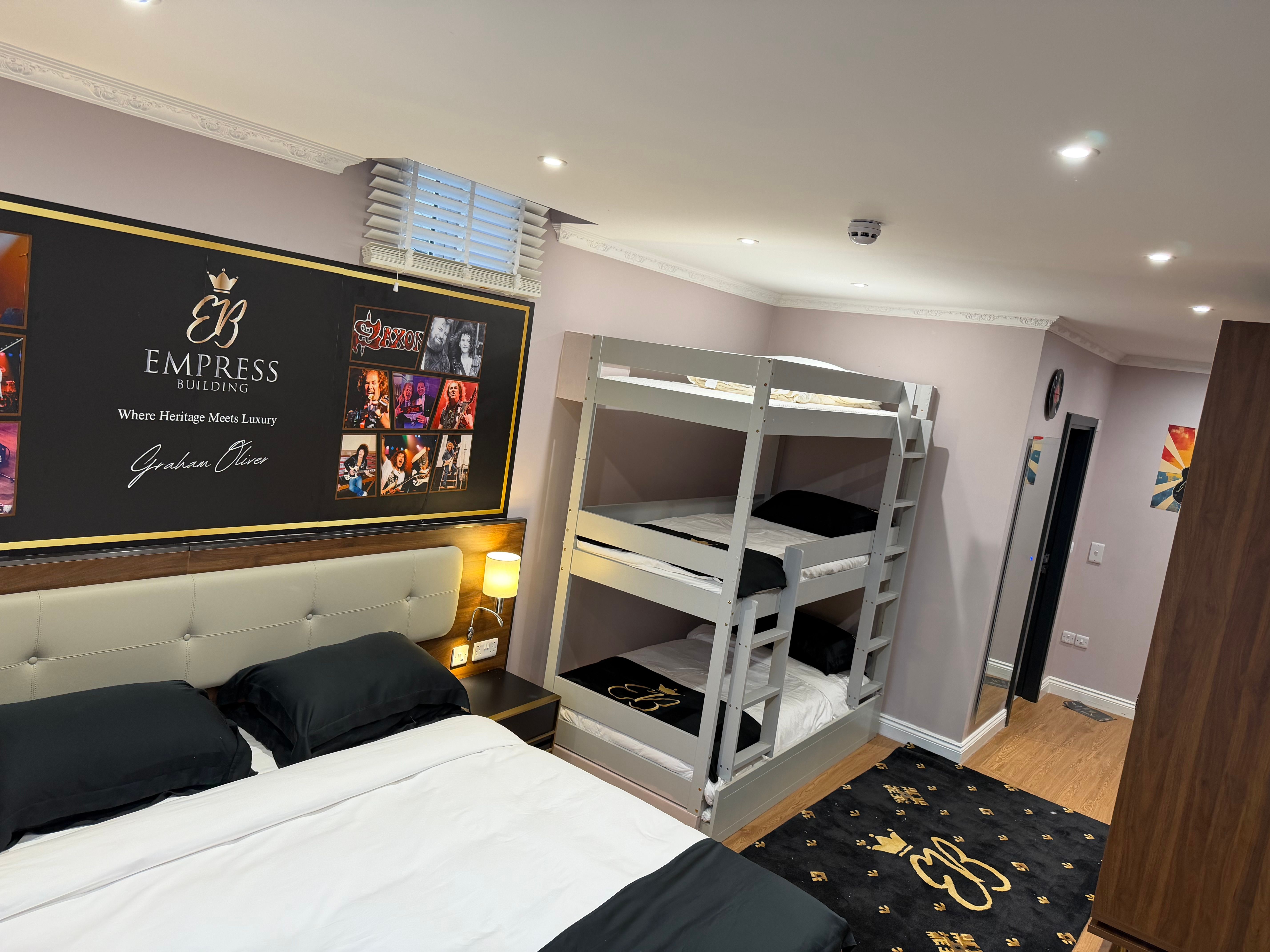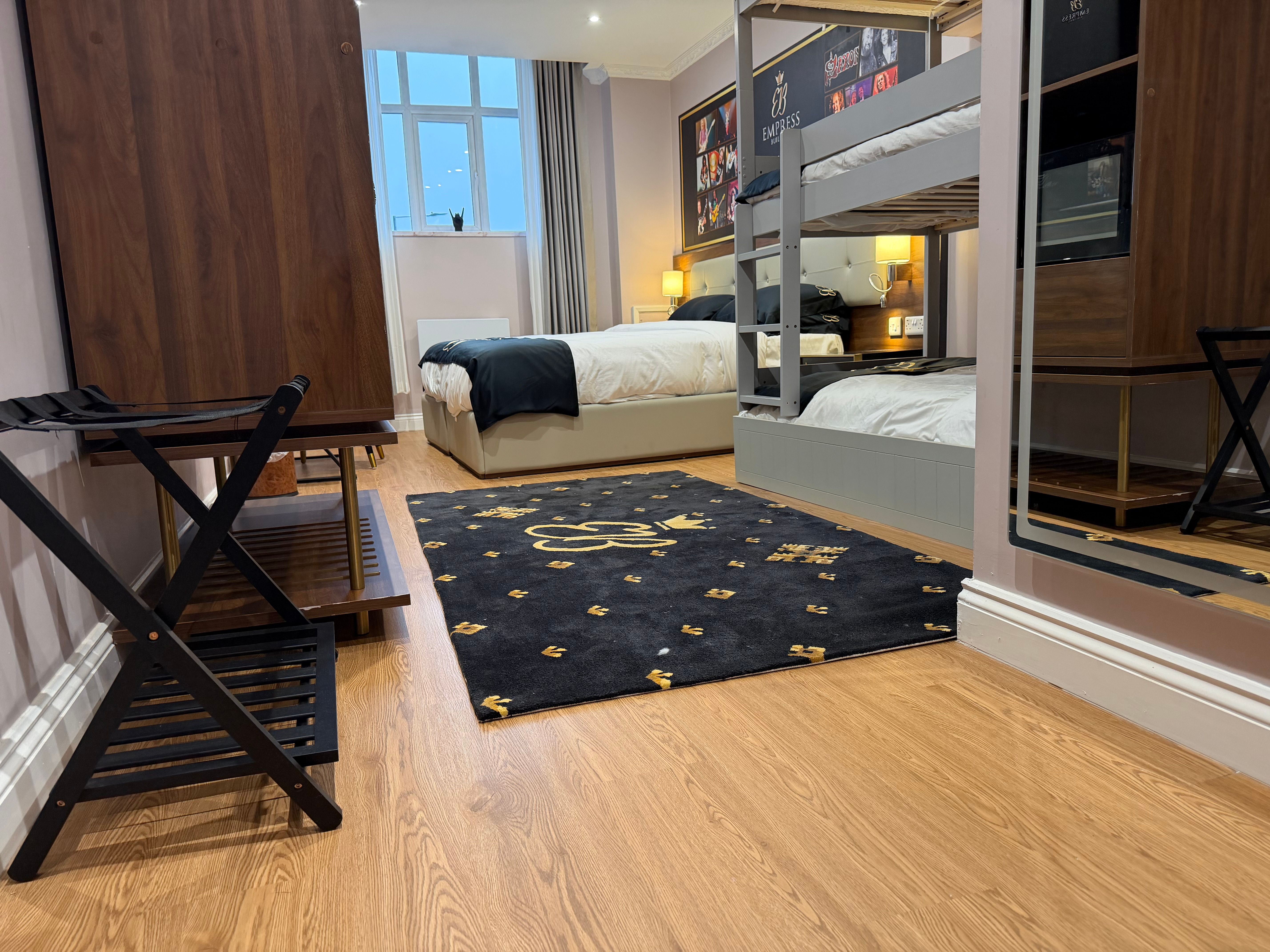 Unwind in a luxurious super king-size bed or opt for two comfortable single beds. The suite also features a 3-tier bunk bed with an additional pull-out trundle, accommodating up to four guests (each bed measuring 200cm x 90cm), making it ideal for groups or family stays. Refresh in your private en-suite, complete with a spacious double rainfall shower and premium fittings.